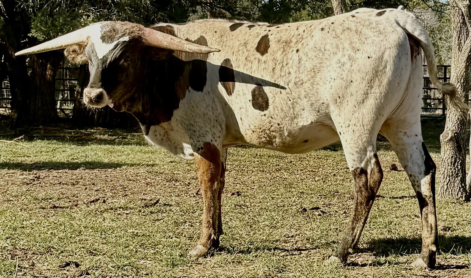 Gazing at Rockette's coat is like looking into a kaleidoscope. Her dizzying array of colors swirl into a pattern that is unique and breathtaking. What produced such beauty? The homozygous wild gene: E+E+, compliments of her dam, a Jamakizm daughter, and her unsurpassed sire, Kid Rock. No surprise these genetics spawned our girl's unique flash and dash ... creating hits that just keep on coming:..solid heft... correct body ...long lateral horn. Unmistakable Jamakizm brindle blends with an emerging black speckle to create an interesting look. This beauty has a strong top, clean bottom and a striking mealy mouth, contrasting with a black nose and a coat that darkens by the day. Dam is a big-bodied beauty, measuring 93" and her sire is the world's longest horned Texas Longhorn bull. The proof is in the pedigree, color analysis and photo. Strong black color traces back 23 times to Don Quixote Spear, considered the breed's original black bull.