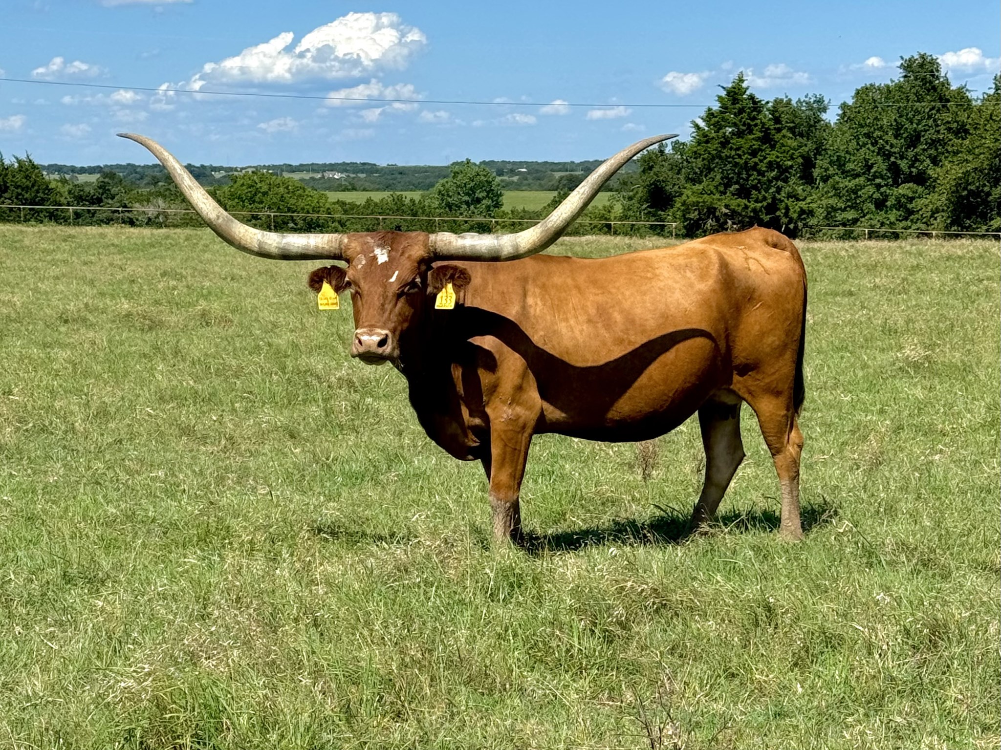 Over 80" TTT and almost 100" Total Horn, this full bodied productive female just had a beautiful Rebel heifer on 12-26-20. She has Starlight, Delta Van Horne, Phenomenon and Diego's Hot Shot in her pedigree. She is tested Johnes and BVD negative and adds both conformation and horn to our program.
